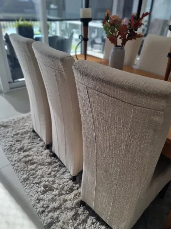 De stoelen zijn met stof bekleed en houten poten.