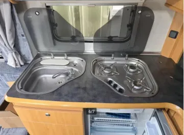 De gezellige en handige rondzit waar de caravan over beschikt, kan ook dienen als slaapgelegenheid. Centraal in de caravan bevindt zich de middenkeuken, uitgerust met een spoelbak, kraan en 3-pits kooktoestel. Er is een boiler aanwezig, die u van warm water voorziet. Om uw etenswaren op te bergen is er een koelkast (110 liter) met vriescompartiment ingebouwd.