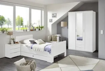 Bijpassende kledingkast met 3 deuren, 3 lades en spiegel. Prijs € 498,-