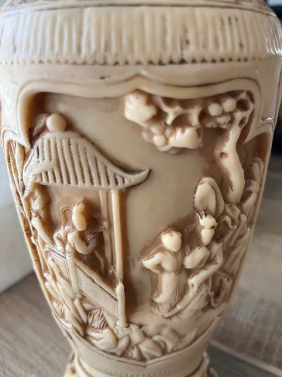 - Oude Chinese resin vaas (hoogte 29 cm) met sculptuur van olifanten