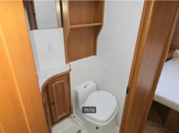 Het in de lengte van de caravan geplaatste bed biedt voldoende ruimte voor 2 personen. Het royale tweepersoons bed is dwars in de caravan geplaatst. U kunt in deze caravan genieten van een weldadige nachtrust dankzij de lattenbodems en traagschuimmatrassen op de bedden. Deze caravan beschikt over een badkamer. Hierin bevindt zich een wastafel en ingebouwd cassettetoilet.
