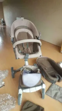 - Stokke kinderwagen met accessoires: bed, stoel, bagagetassen met vakken, winterkleding en regenbescherming.