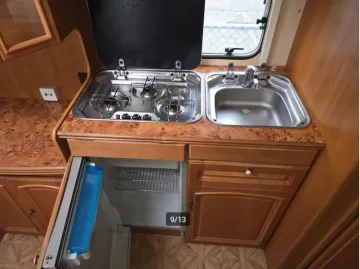 In de ruime treinzit vindt u een gezellige plek om te zitten, deze kan uiteraard ook dienen als extra slaapplaats. De kleine zit, waar de caravan ook over beschikt, biedt een heerlijke plaats om even rustig te spelen, te internetten of te drinken. In de praktische rondzit waarmee de caravan is uitgerust, kunt u genieten van heerlijke maaltijden en gezellige avonden. De keuken is in het midden van de caravan gemonteerd. Er is een warmwatervoorziening in de vorm van een 15 liter boiler aanwezig. Om uw etenswaren op te bergen is er een koelkast (110 liter) met vriescompartiment ingebouwd.
